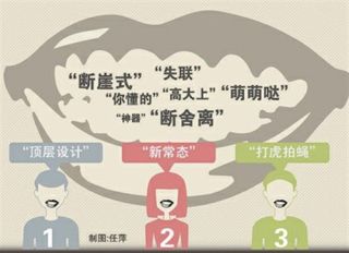 【“打虎拍蝇”“萌萌嗒”入选2014年度十大流行语】语言文字期刊《咬文嚼字》日前揭晓2014年十大流行语,“顶层设计”“新常态”“打虎拍蝇”“断崖式”“你懂的”“断舍离”“失联”“神器”“高大上”“萌萌嗒”入选。评选以“时代价值、社会价值、语言价值”为标准,强调“正能量”效应。 另据文汇报报道,对于今年一些流传度非常高的热词如“小鲜肉”、“暖男”、“任性”、“蛮拼的”等未入选榜单,《咬文嚼字》编辑部表示,语文是社会生活的反映,但流行并不是唯一的标准,像“有钱,任性”、“蛮拼的”、“约吗”等词,在语言的创新性上体现得不够,用意基本沿用了词汇原本的意思,没能体现出流行语对创新语言生活的贡献,因此未能入选。