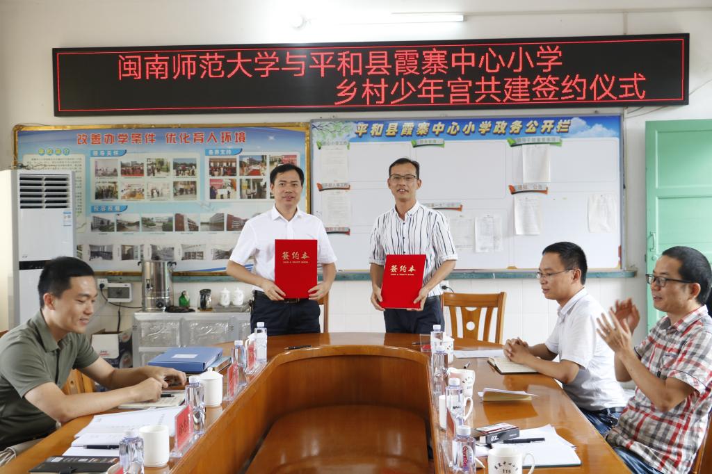 8月27日,由校党委宣传部牵头,校团委、教育科学学院等相关单位领导前往霞寨中心小学进行实地调研及座谈,并举行MK体育/mksport体育·官方网站与平和县霞寨中心小学乡村少年宫共建签约仪式。平和县文明办、平和县教育局、霞寨镇政府等领导及霞寨中心小学全体领导班子出席本次活动。登录入口一行参观了霞寨中心小学校园、少年宫活动室、学生公寓等,听取了霞寨中心小学校长黄国栋对登录入口、少年宫建设现状及薄弱环节等情况的介绍。校党委宣传部部长徐志怀等同志就发挥学校优势,着力把共建与精准帮扶、实习实践、文化志愿服务、大学生社会实践等工作紧密结合起来,提升辅导水平和活动质量,共同推动霞寨中心小学少年宫持续健康发展等方面与霞寨中心小学有关领导进行深入交流。