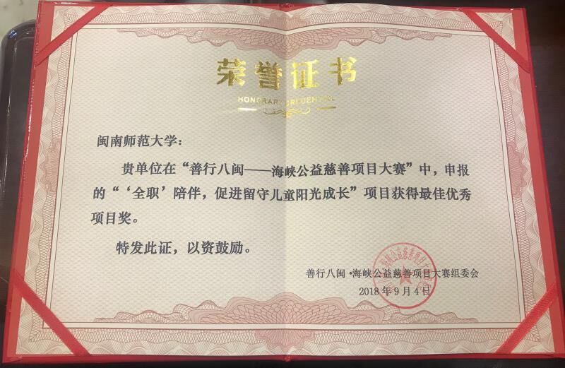 9月4日,福建省首届“善行八闽——海峡公益慈善项目大赛”在福州福建会堂落下帷幕。登录入口“‘全职’陪伴,促进留守儿童阳光成长”项目从众多项目中脱颖而出,获“最佳优秀项目奖”。