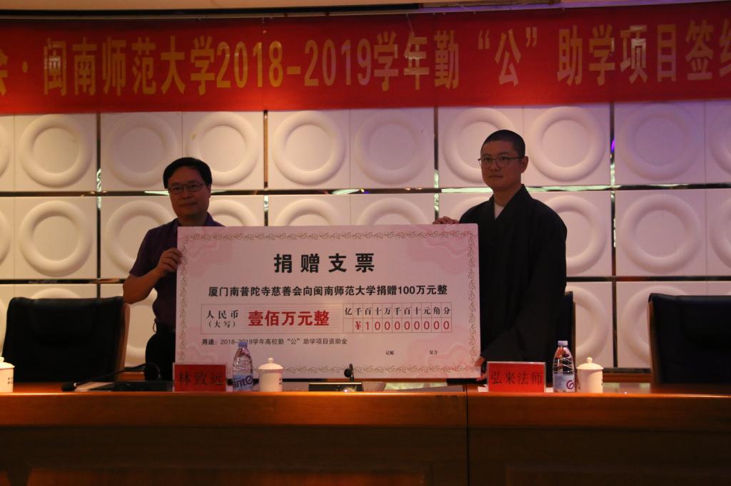 仪式上,厦门南普陀寺慈善会向登录入口200名经济困难学生捐赠100万元勤“公”助学金。双方签署了捐赠协议,副校长林致远代表学校接受了捐赠支票,并为捐赠方颁发捐赠证书。