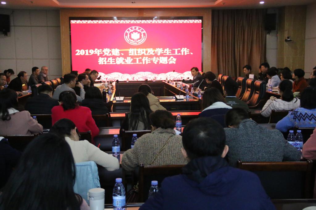 宣传部、统战部、组织部负责人分别在会上传达了2019年全国、全省宣传部长会议精神,全国、全省统战部长会议精神,全省组织部长会议精神及《中共中央关于加强党的政治建设的意见》《中国共产党重大事项请示报告条例》《中国共产党党内关怀帮扶办法》等文件精神。会议对2019年学校统一战线工作、宣传思想和意识形态工作、组织工作、新学期学生工作和团委工作、招生就业和创新创业工作、安全稳定工作等重点工作进行部署,提出了具体要求。