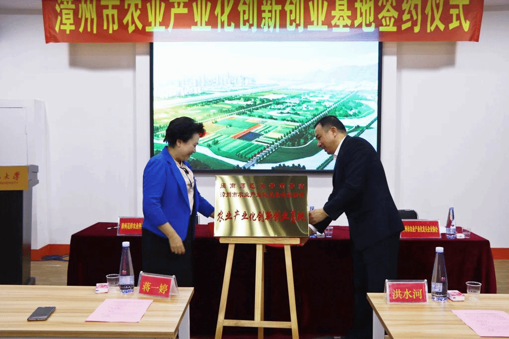 洪水河、张国辉、商学院院长张惠萍共同签订《漳州市农业产业化创新创业基地共建协议》。蒋一婷、洪水河共同为创新创业基地揭牌。据悉,漳州市农业产业化创新创业基地将在农产品生产加工、新食品研发、产品策划开发、技术转化、广告营销、网络营销、学术研究与人才培养等方面积极作为,服务漳州互联网时代新农业发展,努力建成新农业综合服务平台及农业大数据中心。
