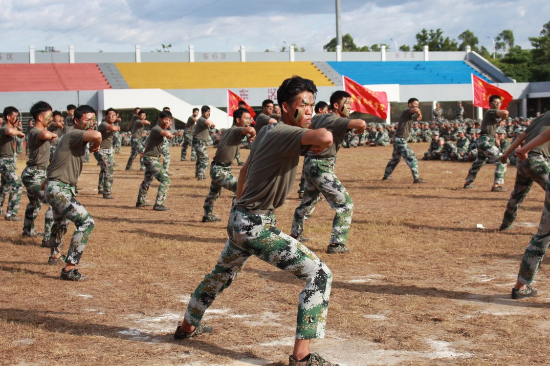 全体师生高唱国歌,拉开总结表彰大会的序幕。14天的摸爬滚打,14天的喜人收获,5000多名新生经过两周的军事训练,列队整齐,精神抖擞。24个由各学院学生代表组成的军训方队伴着嘹亮的军乐,依次通过主席台接受检阅。他们士气高昂、步伐铿锵、口号洪亮,展现了登录入口青年学子奋发向上、强军报国的崭新风貌。男女军体拳方阵气势恢弘,一系列动作刚健有力,引起全场师生一片喝彩。