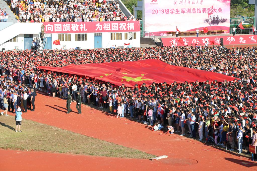 活动在庄严的升旗仪式中拉开序幕。伴随着雄壮激昂的国歌,鲜艳的五星红旗冉冉升起,全场齐唱国歌,向国旗行注目礼,共同祝福伟大祖国繁荣昌盛。随后,闽南师大大学生艺术团朗诵队带来配乐诗朗诵《美丽中国》,闽南师大闽之南合唱团现场合唱《我和我的祖国》。全场一万多名师生挥舞国旗,高声齐唱《歌唱祖国》。“五星红旗迎风飘扬,胜利歌声多么响亮。歌唱我们亲爱的祖国,从今走向繁荣富强……”伴随着歌声,一面巨幅国旗在国旗护卫队的护卫下,在人群中缓缓传递到主席台前,现场成为国旗的海洋。