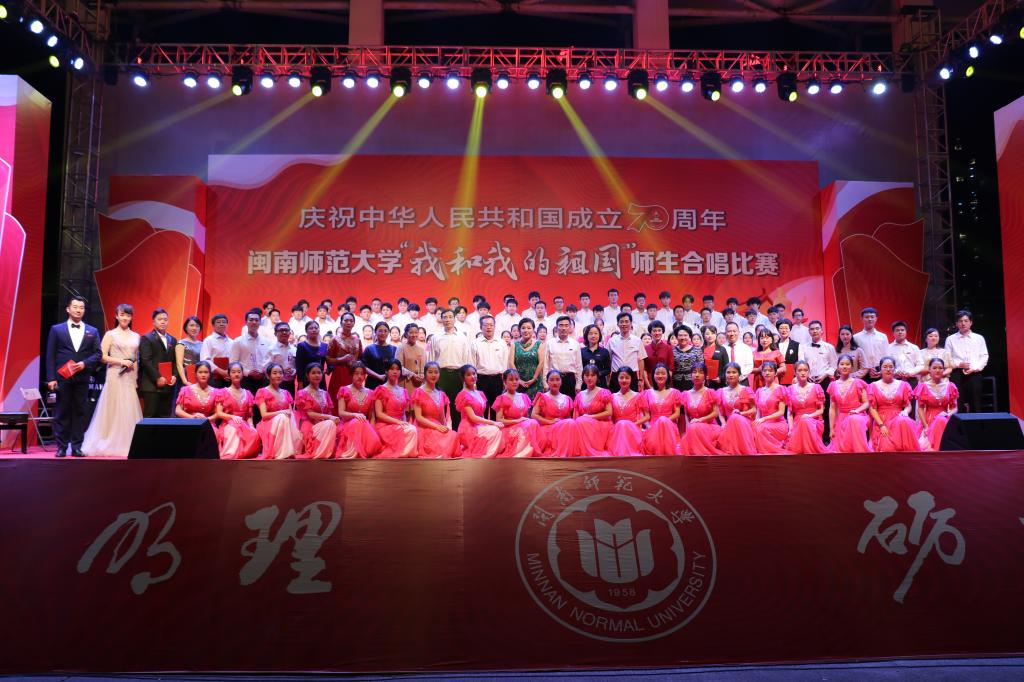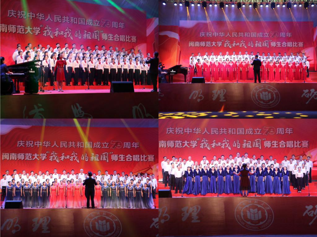 体育学院学生代表队在合唱中加入武术表演和舞蹈;新闻传播学院学生代表队用澳门回归和寄家书的小表演,完成《我和我的祖国》与《七子之歌》的无缝衔接;生物科学与技术学院、物理与信息工程学院、教育科学学院教师代表队在合唱中加入舞蹈、朗诵。艺术学院“闽之南”合唱团倾情演绎了《MK体育/mksport体育·官方网站校歌》《祖国颂》,为全场师生带来美妙的音乐盛宴。
