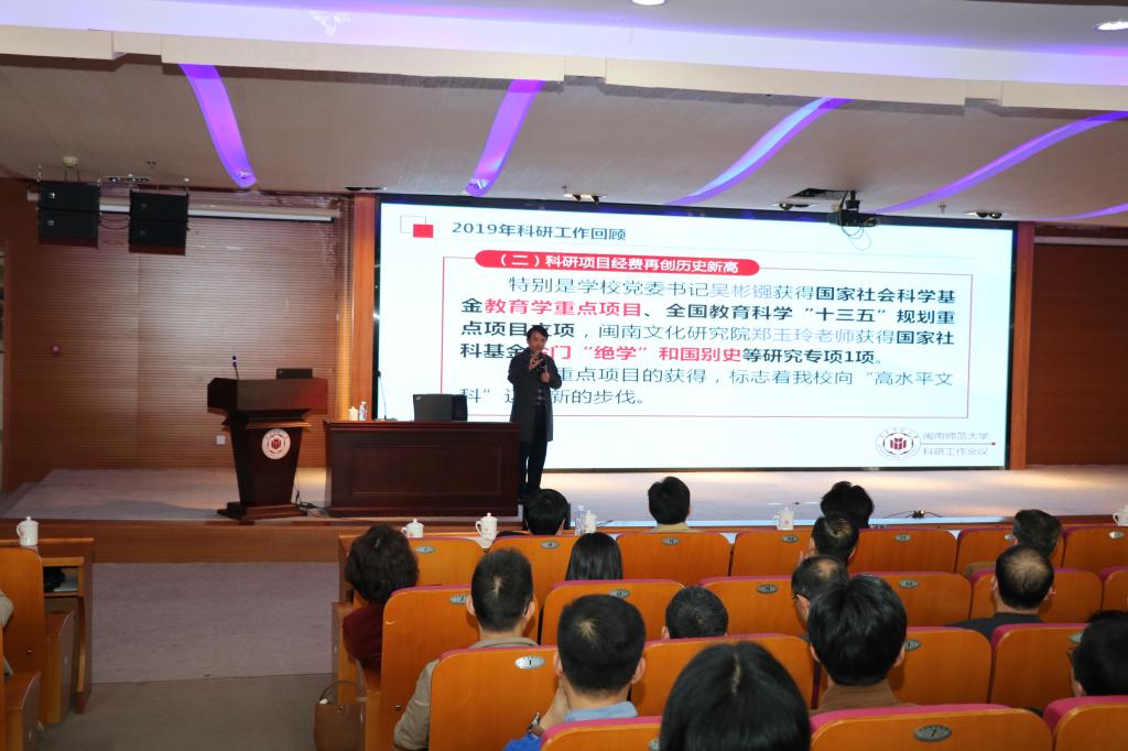 会上,校党委常委、副校长张龙海首先作了题为《纵向提质、横向增量,全面提升登录入口科研水平》的工作报告。报告总结了登录入口2019年科研工作情况及取得的成绩,分析了学校科研工作存在的问题,提出了2020年科研工作的思路和努力方向。张龙海指出,2020年登录入口科研工作要紧密围绕第一次党代会提出的“建设特色鲜明、多学科融合发展的高水平师范大学”的奋斗目标,做到重视纵向课题申报、培育,提高科研质量;拓展横向课题范围,增加经费总量;深化体制机制改革,营造良好的学术生态,全面提升登录入口科研水平。