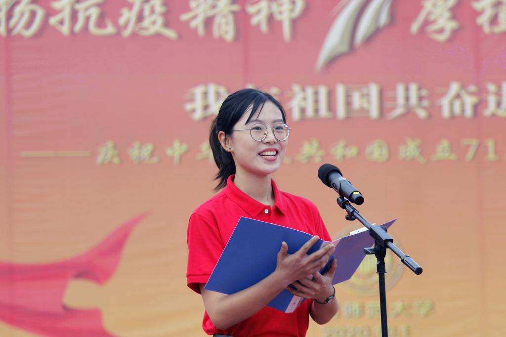物理与信息工程学院教师夏学文教授和教育科学学院学生郑娴婧分别作为教师和学生代表在升旗仪式上发言。夏学文表示,2020年注定是不平凡的一年,一场突如其来的疫情让世界各国猝不及防。中国不仅迅速有效地遏制了国内疫情的扩散,而且在力所能及的范围内向其他有需要的国家提供物资、技术援助和防控经验分享,充分展现了大国担当,作为中国人由衷感到骄傲自豪。作为高校教师,要将拳拳报国之心浸润在日常的工作生活中,为实现中华民族伟大复兴的中国梦贡献力量。郑娴婧号召同学们弘扬抗疫精神,厚植爱国情怀,把爱国情、强国志、报国行融入血脉,走好当代青年长征路,在爱国奋斗中找到立身之本、成才之基;努力学习掌握科学知识,锤炼过硬本领,让青春在党和人民最需要的地方绽放绚丽之花。