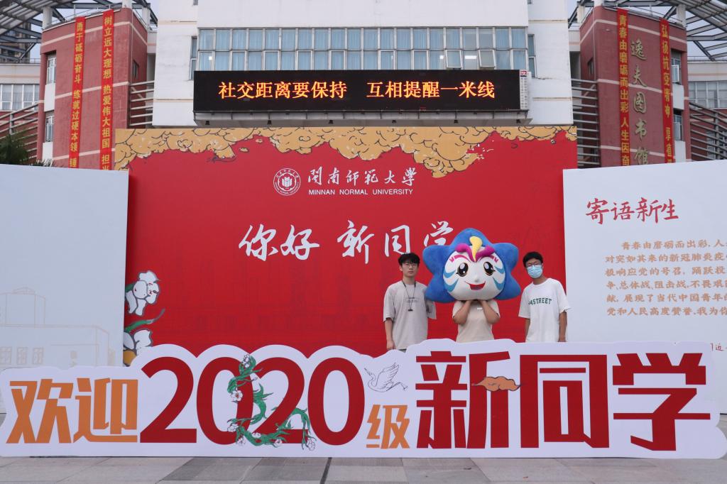校园里,各类迎新标语和展板也让校园充满喜庆的氛围。“乘风破浪的学妹 披荆斩棘的学弟 恭喜你C位出道”“闽南师大拍了拍你 新起点新征程一起加油奔跑吧”“盼星星 盼月亮 终于盼来2020级小可爱”等标语深受学生喜爱;“闽南师大欢迎你”“你好,新同学”“我和大学的第一张合影”等宣传展板吸引众多新生留影合照。
