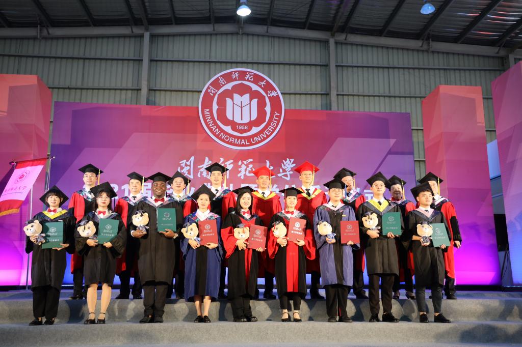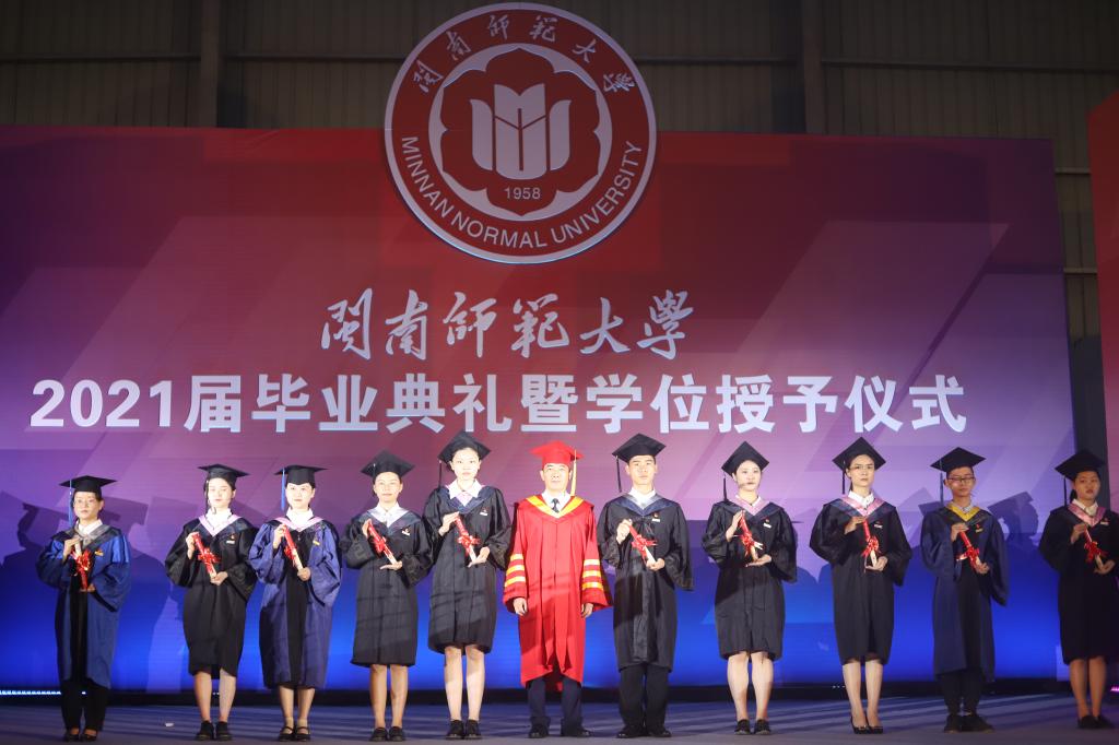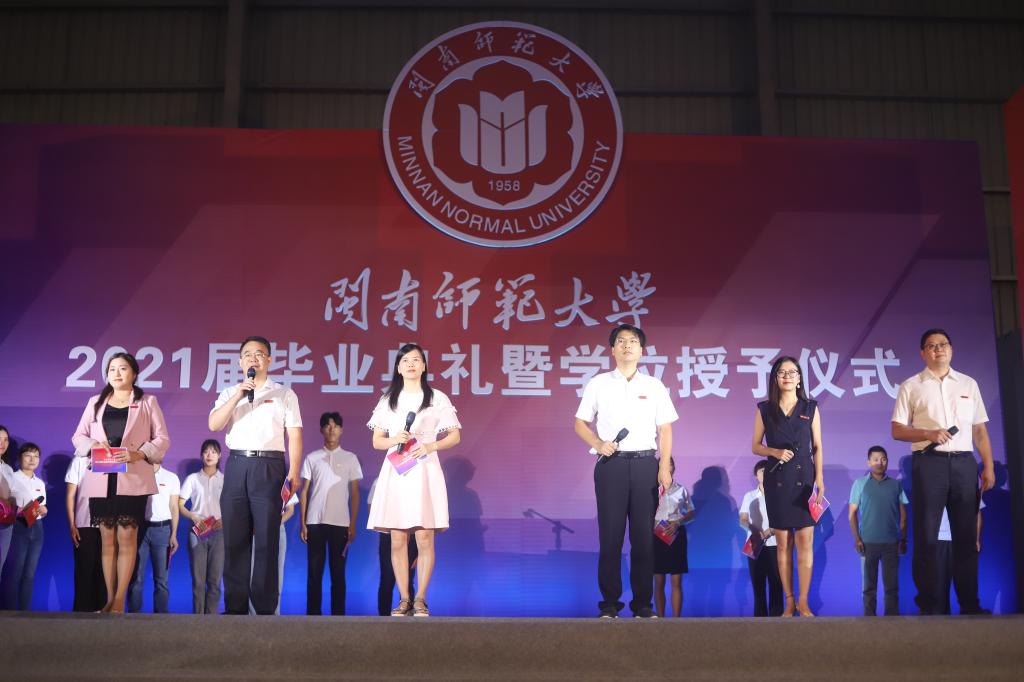 典礼开始前,原创毕业宣传片《再见,闽南师大》首发,视频内的一幕幕唤起属于闽南师大人永不磨灭的记忆。上午8点,毕业生们庄严注视校旗、院旗入场,典礼在国歌声中正式拉开帷幕。校党委常委、副校长张龙海宣读获得博士学位、硕士学位、学士学位人员名单和2021届优秀毕业生表彰决定。今年,学校共有296名研究生获得博士、硕士学位,4295名本科生获得学士学位,将离开熟悉的校园,奔赴祖国的四面八方,走向更广阔的天地,把青春华章写在祖国的大地上。