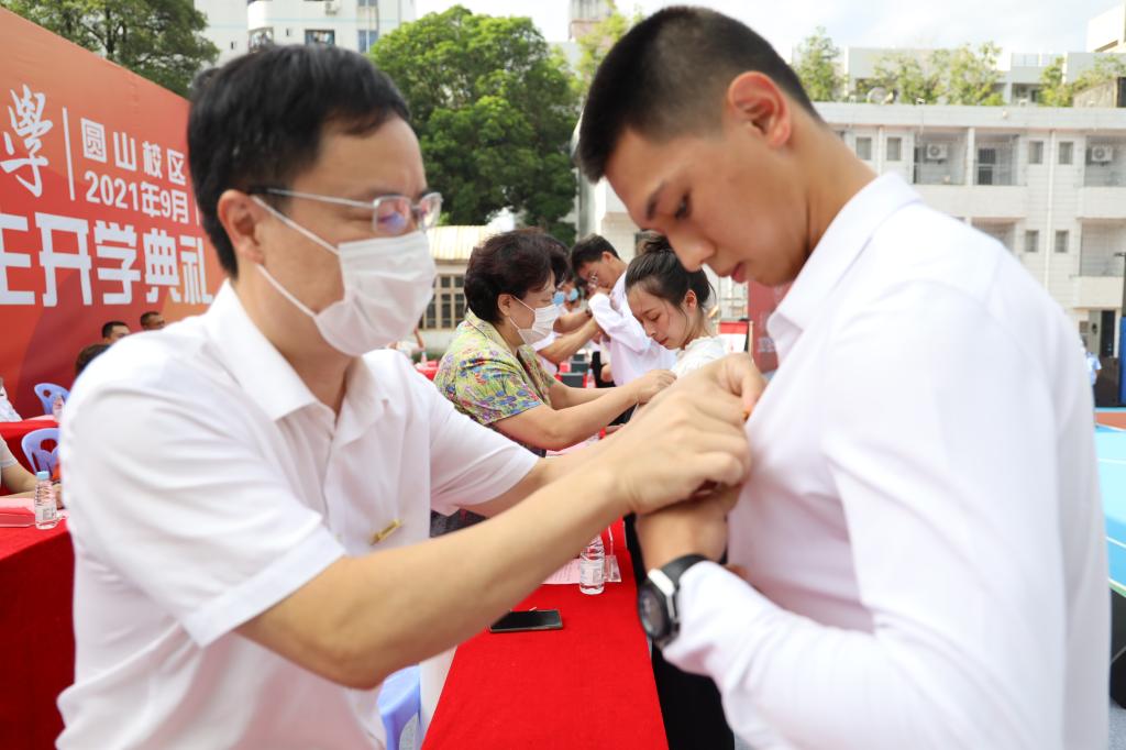 校领导为新生代表佩戴校徽