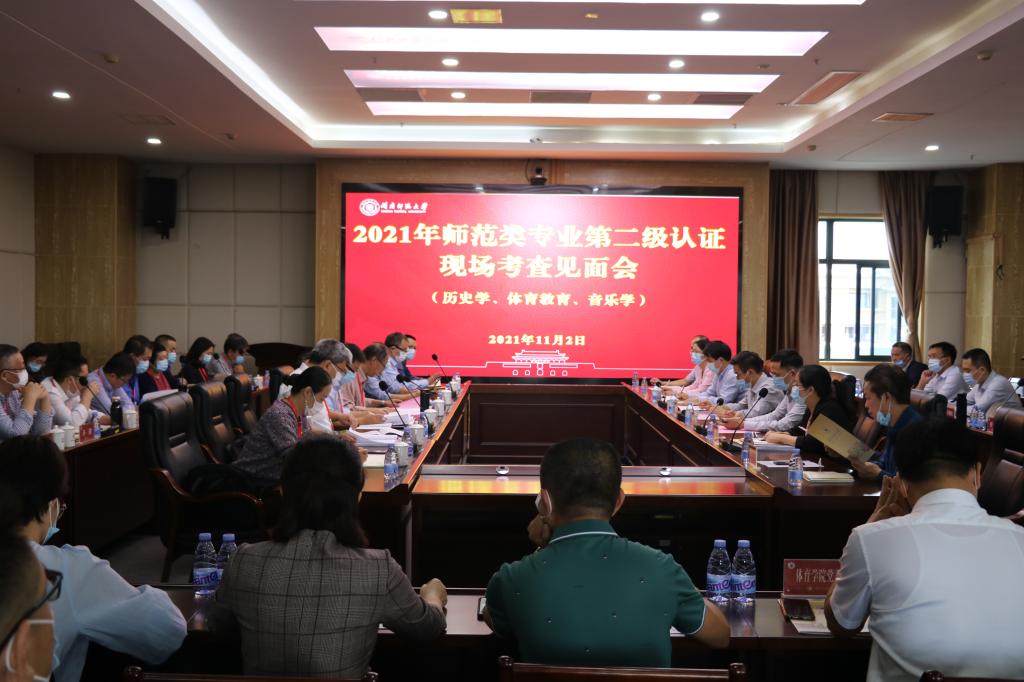 2日上午,现场考查见面会在科技信息楼召开。历史学专业专家组组长傅康生、体育教育专业专家组组长杨晓翔、音乐学专业专家组组长丁锦宏及专家组其他成员,校党委书记吴彬镪,校长李顺兴,党委常委、副校长张龙海,省教育评估研究中心副主任王长旺出席会议。学校有关职能部门负责人,认证专业所在学院党政主要负责人、分管教学院领导等参加见面会。