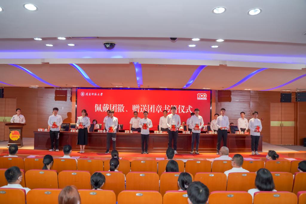 随后举行2021年度新团员入团仪式,与会校领导为新团员代表佩戴团徽,赠送团章和《习近平与大学生朋友们》等书籍。24名新团员代表在校团委学生兼职副书记杨静慧的带领下面向团旗庄严宣誓。