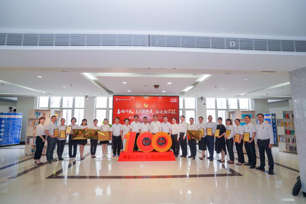 最后,全体师生齐唱团歌《光荣啊!中国共青团》,全场团旗舞动,大会在热烈激昂的氛围中落下帷幕。表彰大会结束后,校领导与获奖代表合影,并参观了福建团史展,2022年五四表彰先进个人、先进集体风采展,剪纸、书法作品展。
