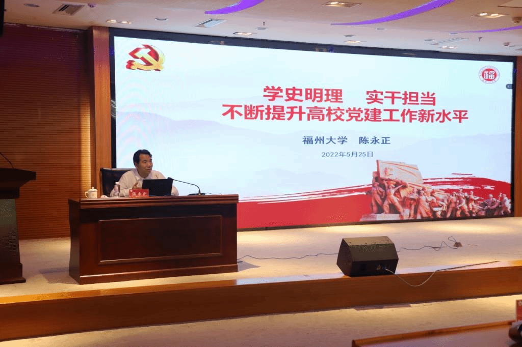 开班式后,福建省第十三届人大常委会委员,福建省人民政府教育督导顾问,福建省社科联副主席,福州大学二级研究员、历史学博士、博士生导师陈永正研究员应邀为学员作题为《学史明理实干担当不断提升高校党建工作新水平》的专题讲座。讲座中,他紧密结合自身丰富的工作经验,围绕“百年党史是一部不断加强党的建设的历史”“党的建设内涵与任务”“高校院系党组织的定位与职能”“院系党组织负责人的基本素质和能力要求”四个方面,就如何推进二级学院党委会和党政联席会议事规则顺畅高效规范运行、如何推进二级学院治理体系和治理能力现代化等,为与会人员作了生动的辅导。