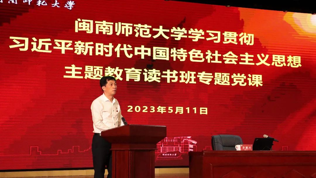 为推进主题教育走深走实,5月11日下午,校党委副书记、校长李顺兴在闽南文化艺术中心讲授题为《中国式教育现代化对提升学校办学价值的启示》的专题党课。全体在家校领导,全校中层干部,学校A类、B类学科带头人和学术骨干,化学化工与环境学院教工第三党支部党员参加。校党委副书记、校主题教育领导小组办公室主任钟发亮主持专题党课。