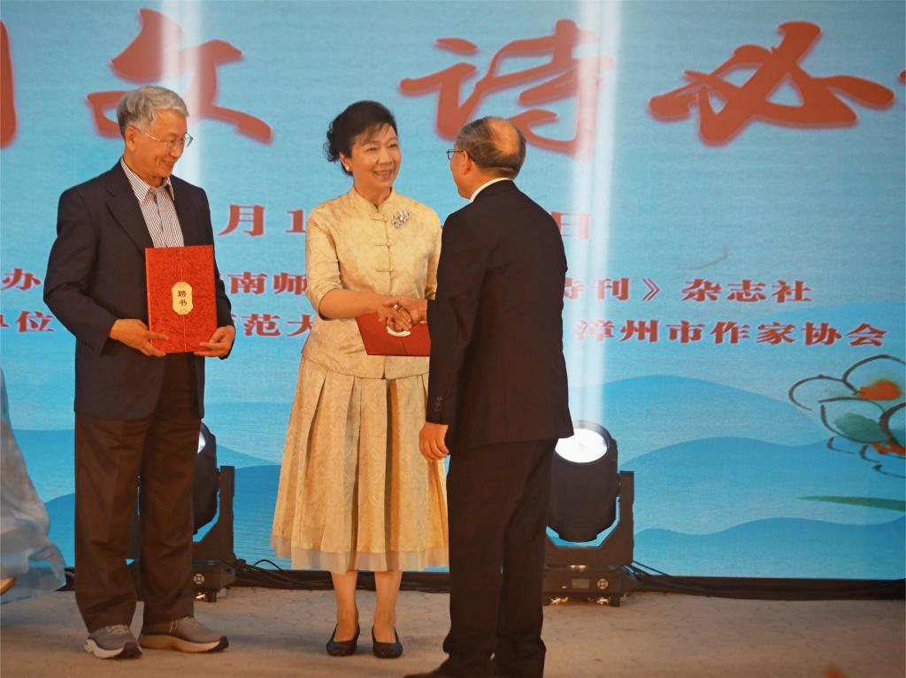 开幕式上,文学院党政领导为“最美诗歌传播者”——文学院教师邱煜焜、台湾诗人萧萧献花,并为萧萧、李阿利两位台湾学者颁发荣誉教授证书。开幕式后举行诗歌朗诵会,来自两岸的诗人、学者、大中小学师生带来《红色记忆•青春抉择》《祖国啊,我亲爱的祖国》《诗词里的中国》等诗歌作品的朗诵表演节目。