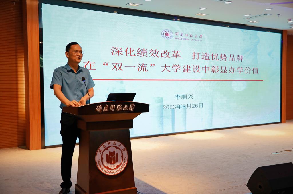 校长李顺兴以《深化绩效改革打造优势品牌在“双一流”大学建设中彰显办学价值》为题作新学期工作部署。他简要回顾了学校一年来的几件大事,对学校发展形势作了分析研判,希望大家主动创造办学价值、突破发展瓶颈、推进绩效改革。他指出,当前科技革命、社会发展需求和高等教育发展规律表明,特色发展是现代大学的生存之道。要强化特色发展的首要保障,不断增强党的政治引领力,落实好立德树人根本任务,把牢意识形态工作主动权,全面推进依法治校,把党的领导贯穿办学治校、教书育人全过程。要认清特色发展的特征表现,从“扬长补短”向“扬长去短补新”转变,加快学科专业调整和优势学科培育,实现“一文一工”双轮驱动,增加标志性科研产出,加快品牌建设。要抓住特色发展的动力来源,从人力资源、奖励绩效、资源整合进行绩效优化,不断巩固扩大校内综合改革成果,持续提升治理现代化水平。要拓展特色发展的外部延伸,前瞻落实两岸政策,增进人才供需契合,创新国际办学方式,通过引进外界资源充实内涵发展支撑,以内部改革创新推动产出更大办学价值。