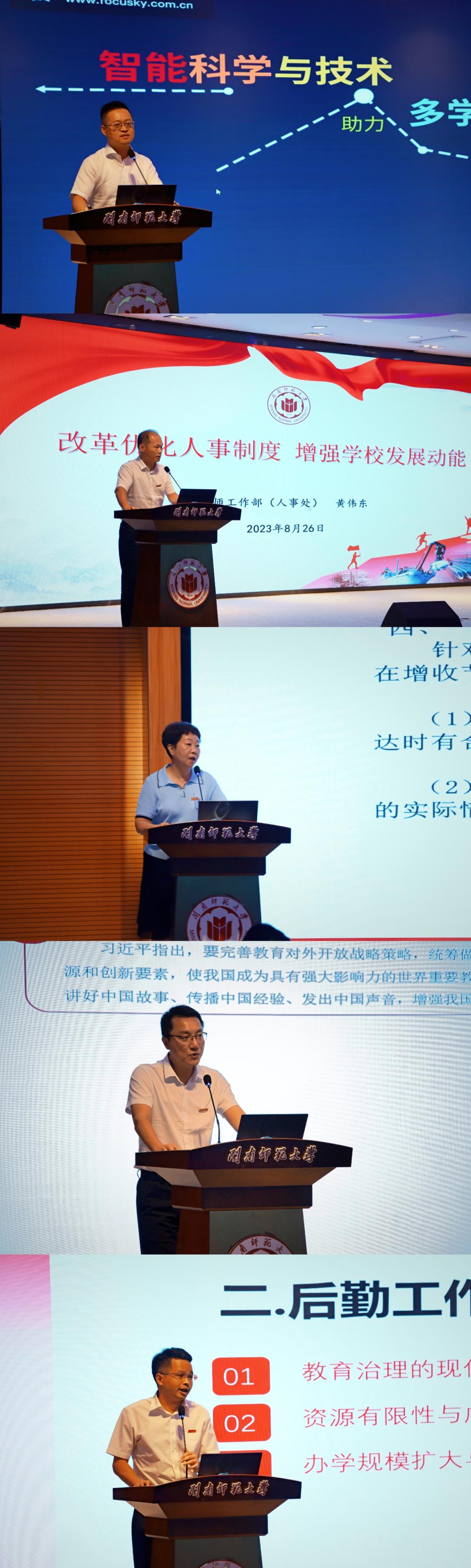 校党委常委、副校长林致远作《完善“一校两区”建设规划 优化办学基础设施配套 多措并举保障学校省一流大学建设》的专题报告。物理与信息工程学院院长陈志翔、学科建设与研究生工作处处长李建辉、教师工作部(人事处)部(处)长黄伟东、财务处处长陈茜、海外教育学院院长李庆瑶、后勤管理处副处长(主持工作)方胜强分别作大会发言。