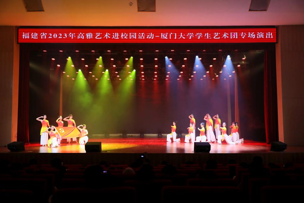 据悉,高雅艺术进校园活动是教育部、文化部、财政部开展的一项普及高雅艺术的活动,将高雅艺术融入校园文化建设中,丰富高校校园文化生活。此次展演的《南强颂》是由厦门大学师生自编自导自演的一场历史文化晚会,近两百名学生演员参与演出,为现场观众展示了厦门大学办学治校的辉煌历史和学校深厚的文化底蕴。