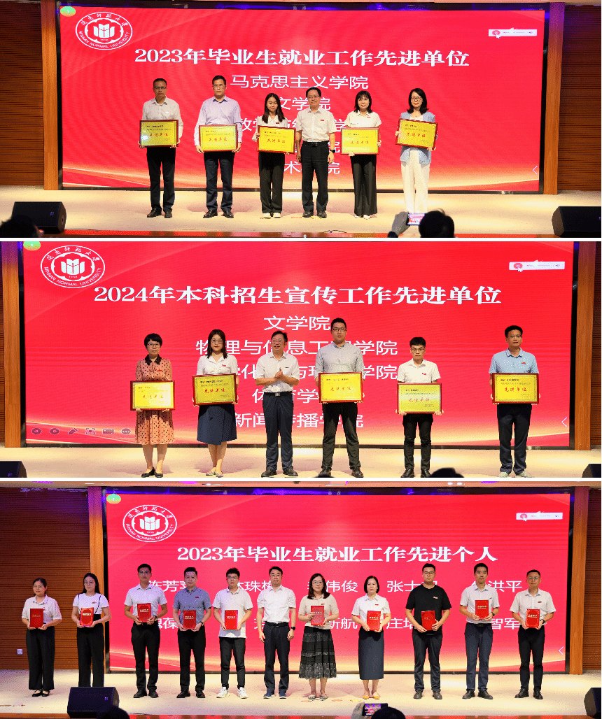 随后,何绍福宣读《MK体育/mksport体育·官方网站关于表彰2024年本科招生宣传工作先进单位和2023年毕业生就业工作先进单位、先进个人的决定》,校领导为获奖单位及个人颁奖。文学院党委书记林晓、体育学院党委副书记方芳分别就学院在毕业生就业工作和本科招生宣传工作中的经验做法作交流发言。