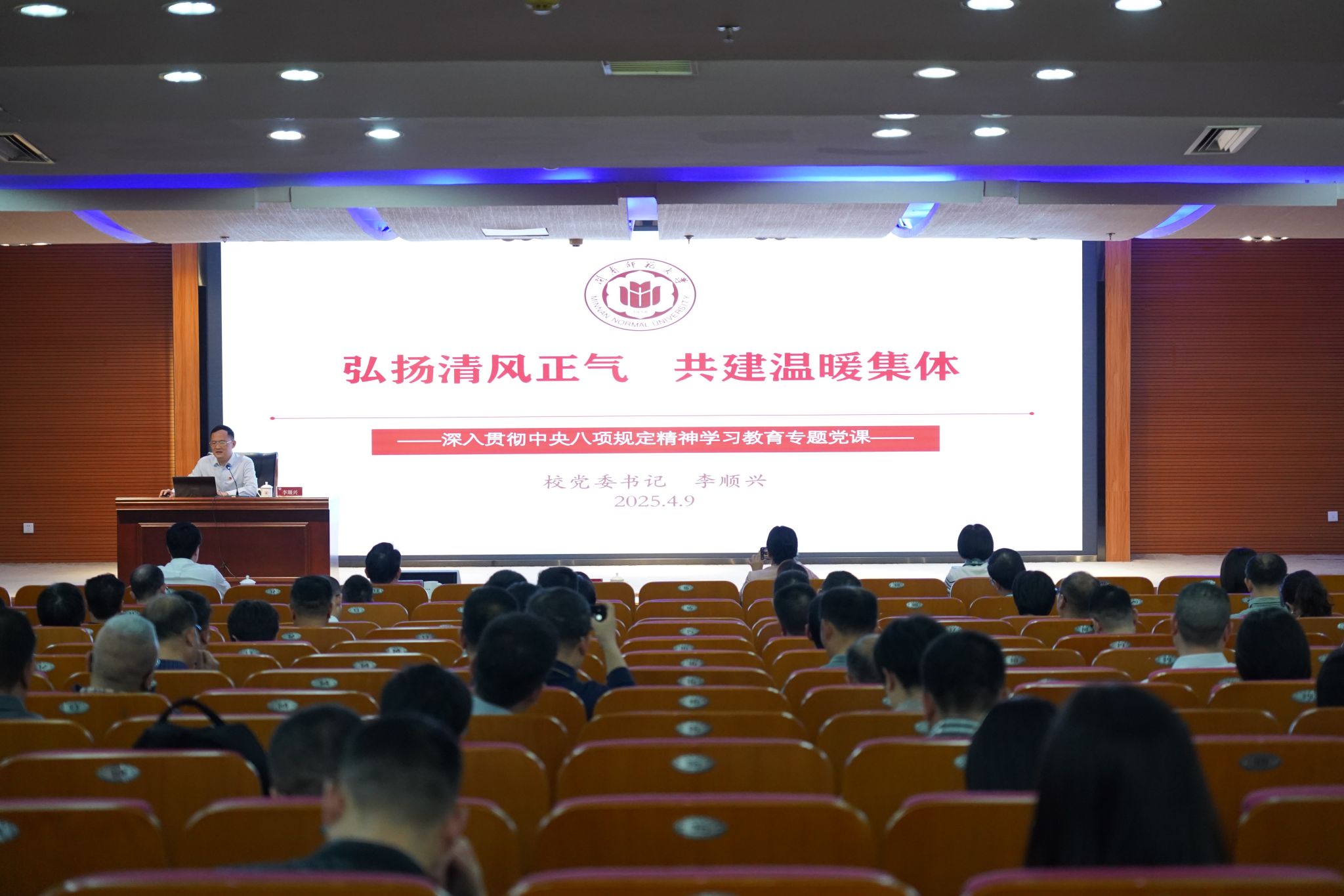 开班式后,李顺兴以《弘扬清风正气 共建温暖集体》为题讲授专题党课。他结合各类典型案例,生动阐释了开展深入贯彻中央八项规定精神学习教育在巩固执政根基、增强党员政治自觉等层面的重要意义,剖析了当前高校落实中央八项规定精神的突出问题。他强调,要构建学习教育和作风建设的责任体系,深化审巡纪财联动监督,聚焦科研经费、基建采购等重点领域开展专项整治,坚决“由风查腐”“由腐纠风”。要以学习教育推动管理体制改革,建立党员干部“三省吾身”长效机制,强化依法治校与目标管理,优化资金、人才等资源配置。要坚持问题导向,把扎实开展学习教育同推动干事创业、改进作风、服务师生密切结合起来,细化“创先争优年”任务清单,将学习教育成效转化为办学发展成效。他要求,各级党组织要坚持政治引领,协力共建温暖集体,扎实推动作风建设,通过增强服务意识、建设廉洁校园、推进团结互助,营造创先争优的浓厚氛围,为建设教育强国贡献闽南师大力量。