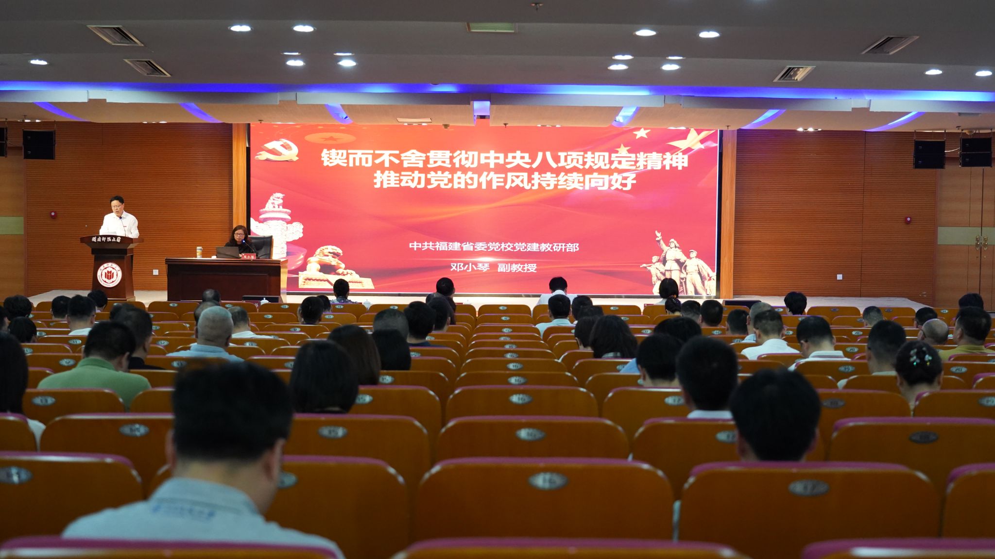 5月14日下午,校党委在逸夫图书馆五楼报告厅举行深入贯彻中央八项规定精神学习教育专题辅导报告会。福建省委党校党建教研部邓小琴副教授应邀作《锲而不舍贯彻中央八项规定精神 推动党的作风持续向好》专题辅导报告。校党委副书记、党委学习教育工作专班副主任林致远主持会议。