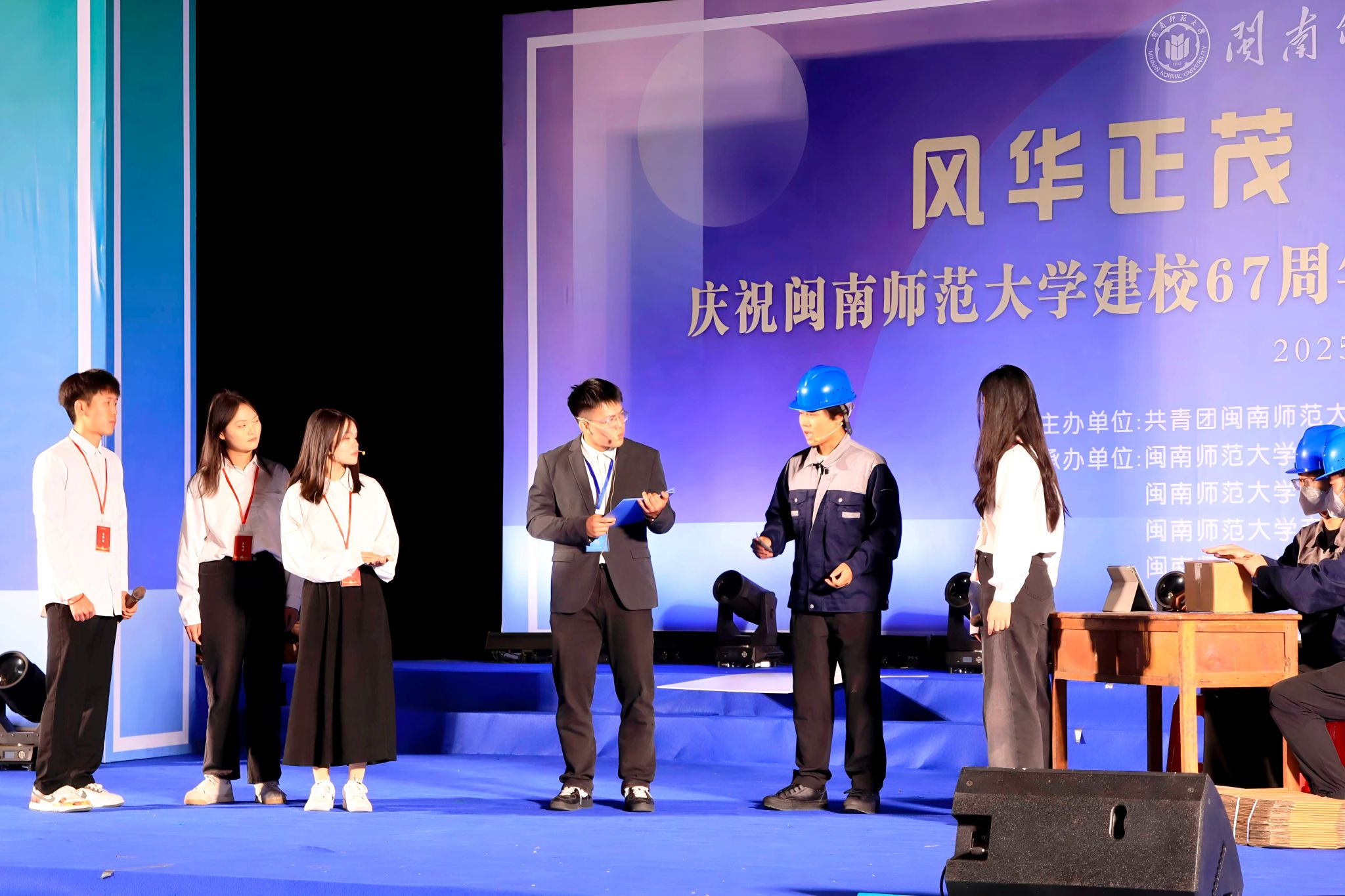 晚会以“风华正茂 圆山新章”为主题,紧扣庆祝建校67周年主线,设置“文韵流转·青春起航”“商略今朝·创见未来”“史地交响·时代回响”三个篇章,融合朗诵、歌曲、舞蹈、话剧、模特秀、器乐、说唱等多种艺术形式,展现了闽南师大人文荟萃、昂扬向上的校园文化与精神风貌。晚会在由校大学生艺术团带来的器乐《权御天下》中暖场启幕。文学院学子以朗诵《中华少年》、歌曲《稻香》、舞蹈《采薇》《Aya》诠释了人文底蕴与青春活力的交融;商学院学子通过话剧《跃迁》、模特秀《肖韵·万象》、朗诵《这束光》演绎青春的多元风采,校大学生艺术团街舞《Fusion Flow》以动感节奏点燃全场;历史地理学院学子演绎的话剧《预制爱》和校大学生艺术团带来的说唱《风起芗江》、拉丁舞《歌舞青春》相继登场,诠释了艺术与情感的共鸣。压轴环节中,时代红歌联唱《跨越时代的回响》气势恢宏,为晚会画上圆满句号。