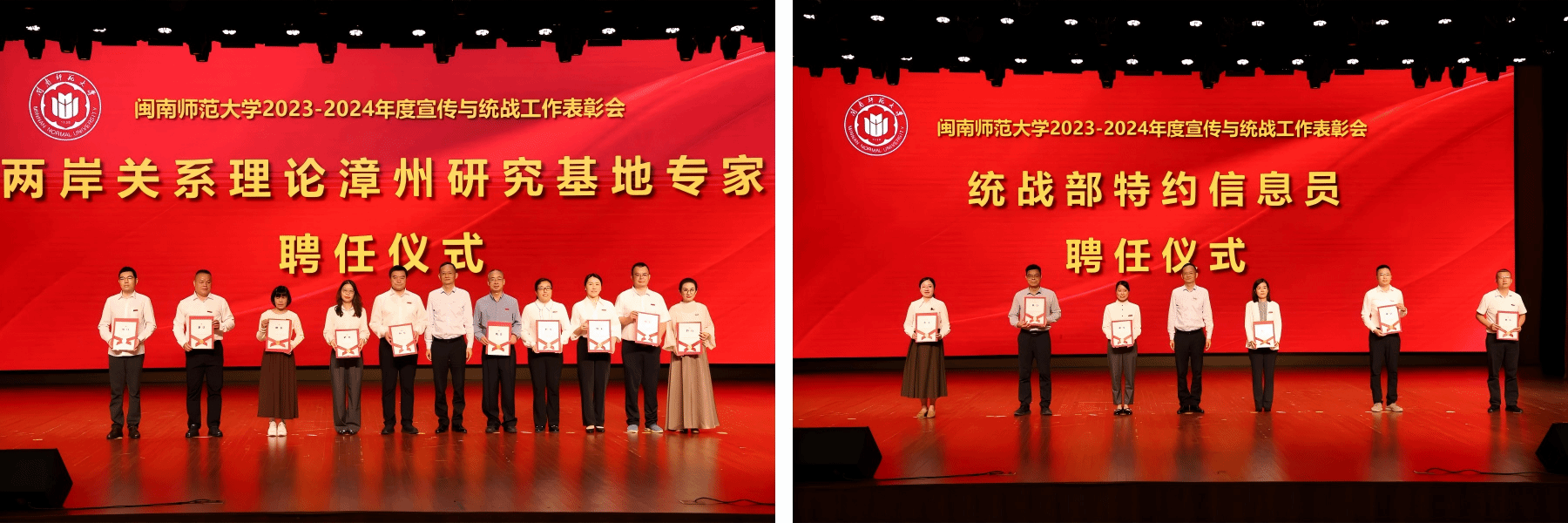 随后,举行2023—2024年度宣传与统战工作表彰会。何绍福宣读表彰决定,校领导为获表彰对象颁发奖杯、奖牌,并为两岸关系理论漳州研究基地专家、统战部特约信息员颁发聘书。