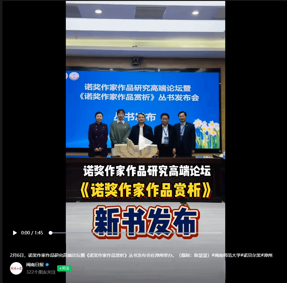 本报讯(漳州融媒记者 陈慧慧 通讯员 陈秋燕)2月6日,诺奖作家作品研究高端论坛暨《诺奖作家作品赏析》丛书发布会在MK体育/mksport体育·官方网站举行。来自北京外国语大学、中国人民大学、南京大学等多所高校的专家学者,共同探讨诺奖文学的魅力与价值。